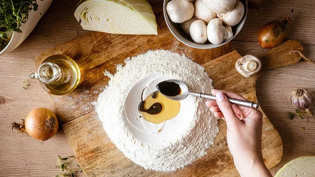 Hell melet oppå en benkeplate og lag en brønn i midten. Hell oppi olje, Kikkoman Soyasaus og varmt vann. Bland og kna til deigen er glatt og smidig. Dekk deigen med en bolle og la den hvile i ca. 20 minutter