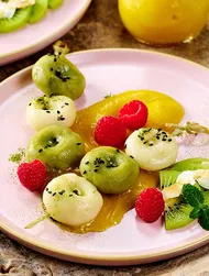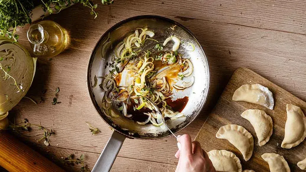 Skjær løken i tynne båter og sauter i oljen. Tilsett honning, Kikkoman Soyasaus og halvparten av timianbladene. Server dumplingsene toppet med karamellisert løk og overdrysset med resten av timianbladene.