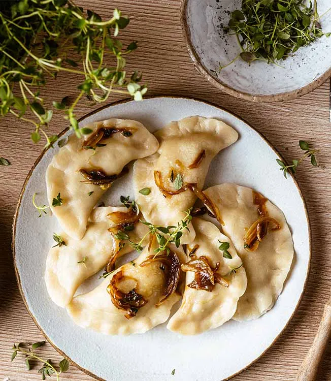 Håndlagede dumplings fylt med hvitkål, champignon og løk. Kikkoman Soyasaus og Kikkoman Kimchi Chilisaus tilfører umamidybde og en mild kryddersmak som gjør denne enkle retten til et oppmuntrende og varmende måltid.