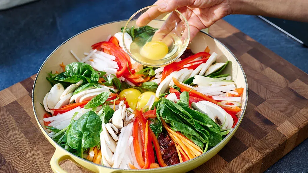 Knekk eggene over grytens midtpunkt. Sett gryten på middels varme og hell vannet jevnt rundt ingrediensene. Når eggene og grønnsakene er gjennomkokt, rør forsiktig om så ingrediensene blandes, og server.