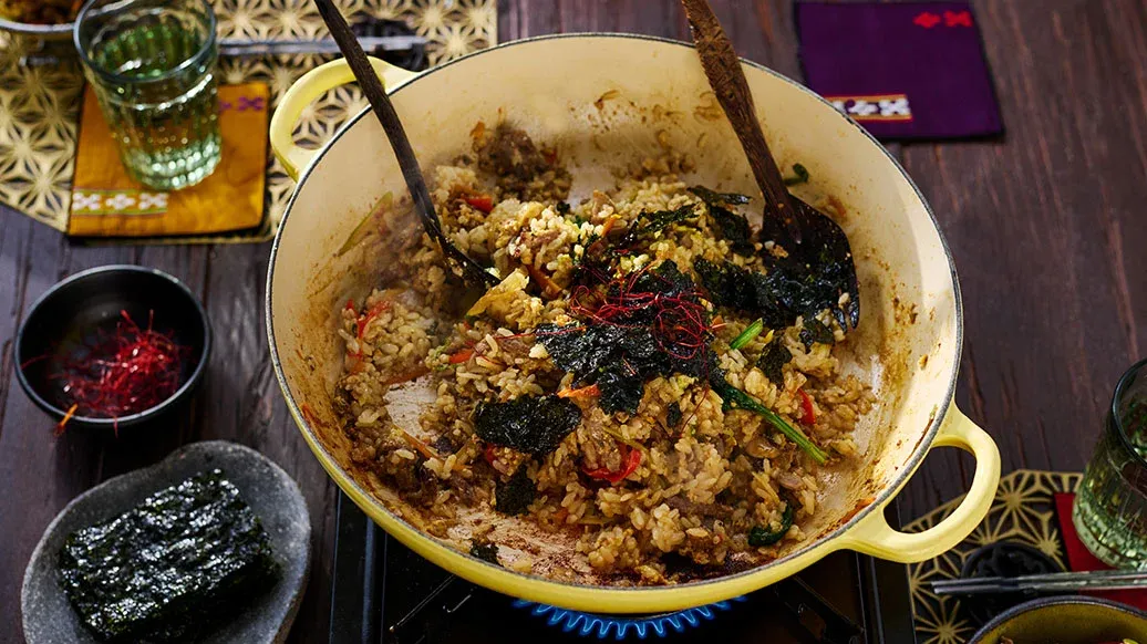 Varm opp Kikkoman Sesamolje i en panne. Tilsett kokt ris og Kikkoman Teriyaki Saus med Sesam og stek under omrøring til alt er gjennomvarmet. Server stekt ris sammen med ferdig hot pot.