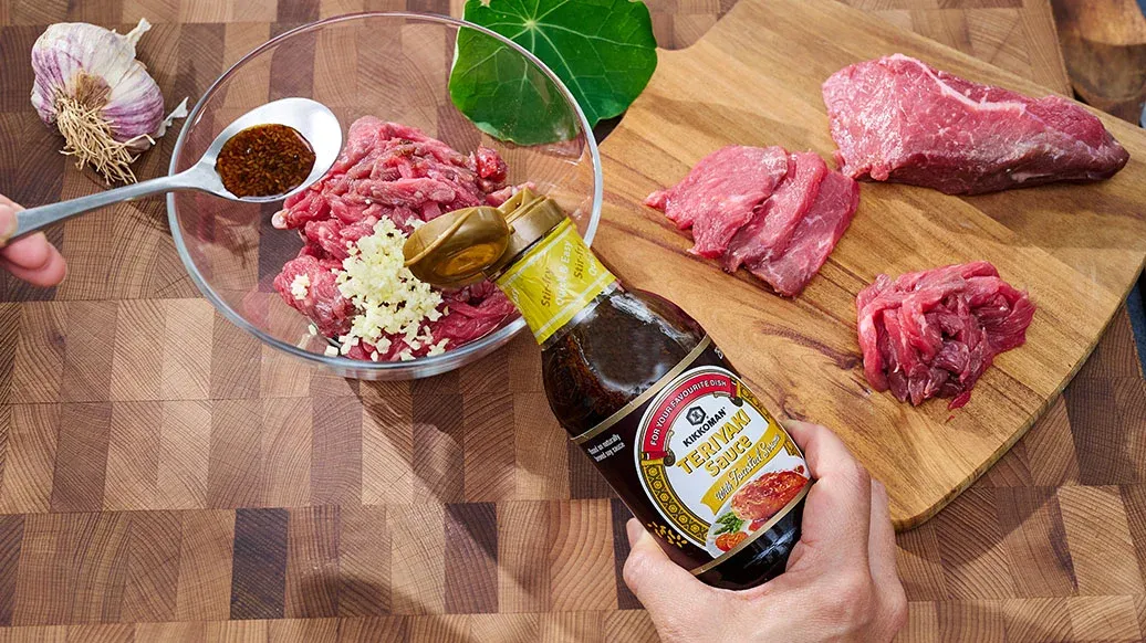 300 g tynne skiver storfekjøtt eller svinekjøtt (kjøttdeig eller tofu kan også brukes) – 1 fedd hvitløk, raspet – 1,2 dl Kikkoman Teriyakisaus med Ristede Sesamfrø