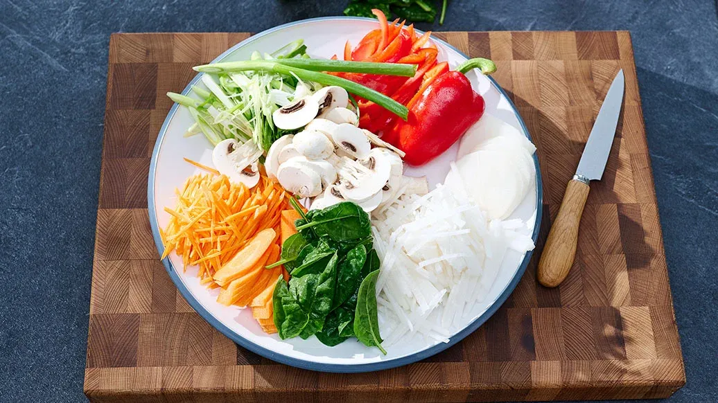 300 g vinterreddik (daikon) – 300 g gulrot – 100 g vårløk – 100 g spinat – 150 g sopp (f.eks. shiitake eller enoki) – 1 rød paprika (200 g)