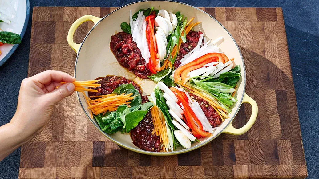 Ha Kikkoman Sesamolje i en gryte. Del det marinerte kjøttet fra steg 1 i 5 porsjoner og legg dem i gryten i en sirkel med luft imellom. Legg grønnsakene fra steg 2 jevnt rundt kjøttet i samme sirkelmønster.