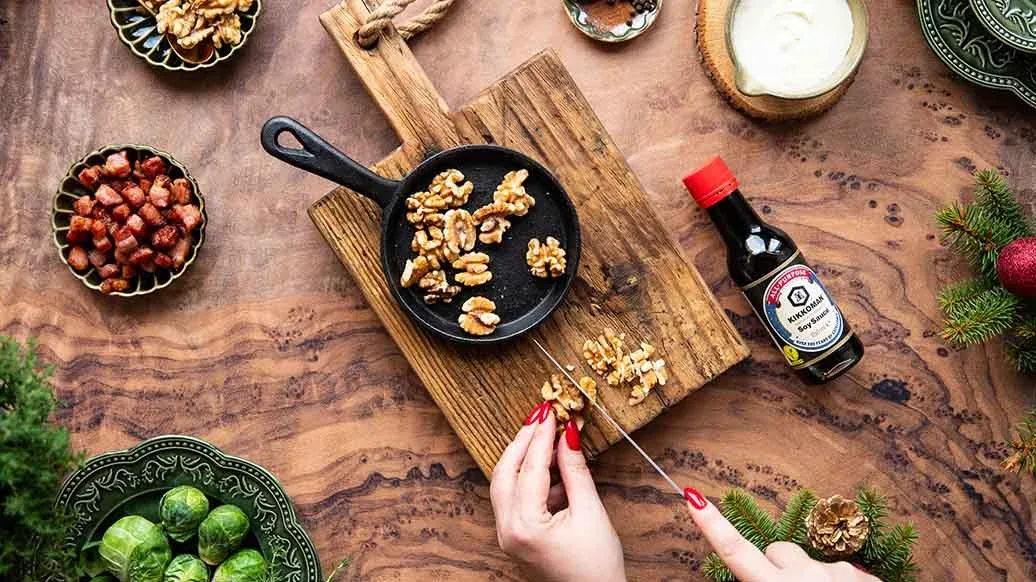 En jevn og varmende suppe med rosenkål og poteter, samt røykfylt bacon og en skvett Kikkoman Soyasaus for ekstra smaksdybde. Toppet med knasende sprø valnøtter og en klatt crème fraîche blir dette en festlig og elegant forrett.