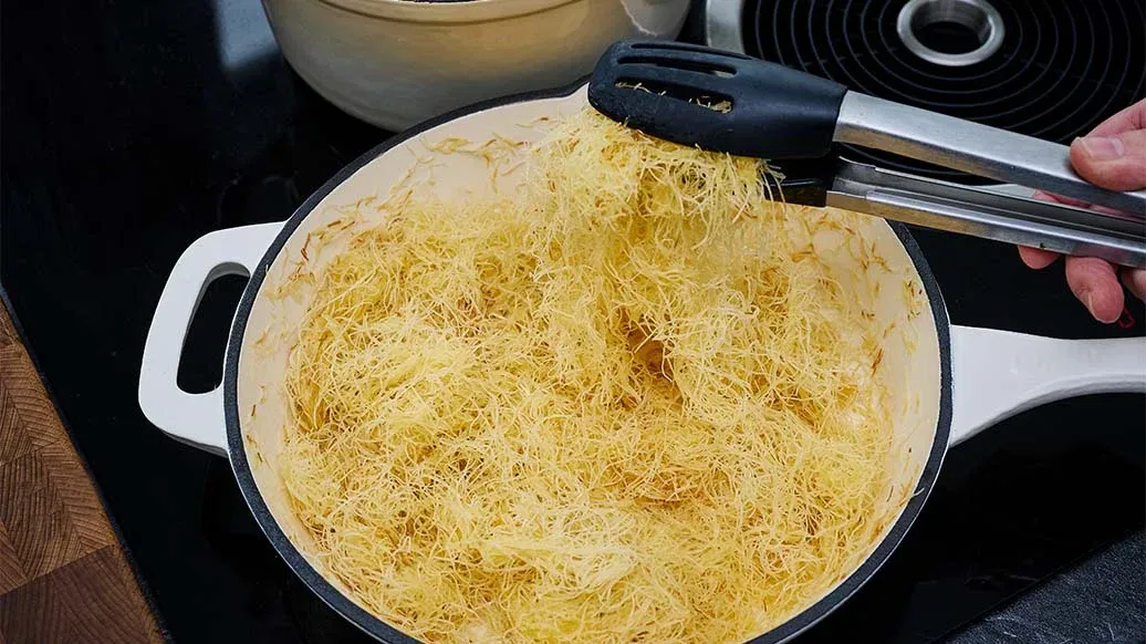100 g smør, pluss ekstra til steking – 200 g kadayif (strimlet filodeig)