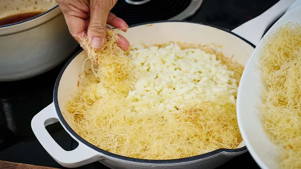 Smelt smøret, og bland godt med kadayif til deigen er jevnt overtrukket.