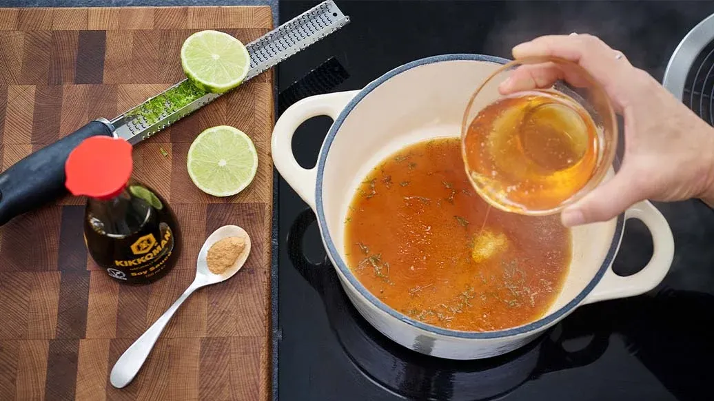 Finrasp litt skall fra limen, del den deretter i to og press ut saften. Ha skall og saft i en liten panne med honning, Kikkoman Soyasaus, kanel og ca. 75 ml vann. La det småkoke forsiktig i 3–5 minutter, tilsett deretter rosenvann om ønskelig.
