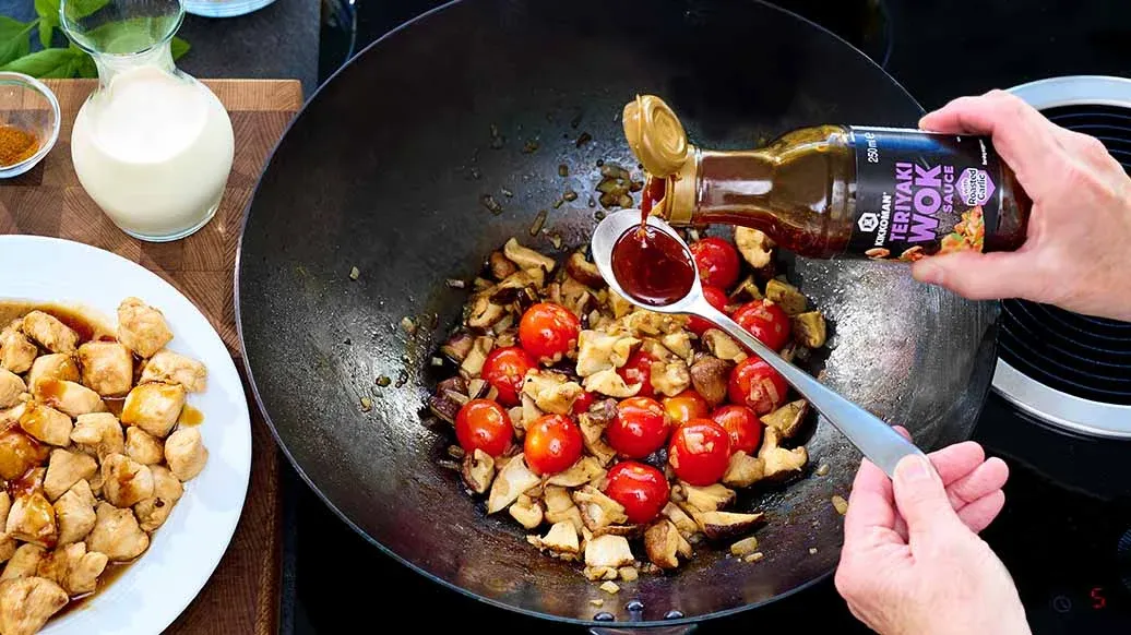 500 g kyllingbrystfilet – 4 ss Kikkoman Teriyaki Saus med Ristet Hvitløk – 1 ss Kikkoman ristet Sesamolje