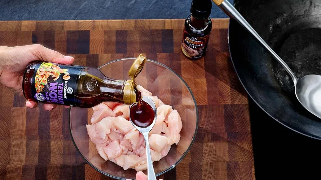 Skjær kyllingfileten i terninger eller strimler og mariner i Kikkoman Teriyaki Woksaus med Hvitløk i ca. 5 minutter. Varm opp Kikkoman Sesamolje i en wokpanne, stek kyllingfileten i ca. 8 minutter og ta den deretter ut.