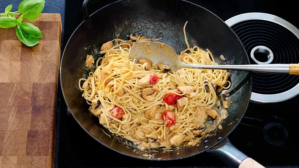 Bland sausen med pastaen og kyllingen i wokpannen, fordel på tallerkener, garner med basilikum og sever.