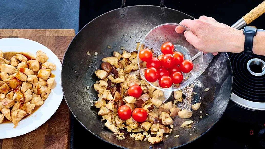 For å lage sausen, smelt smøret i wokpannen. Skjær soppen i ca. 2 cm store biter. Skjær løken i terninger, finhakk hvitløken og sauter begge sammen med soppen i smeltet smør i ca. 5 minutter. Tilsett cherrytomatene og sauter i ytterligere 3 minutter.