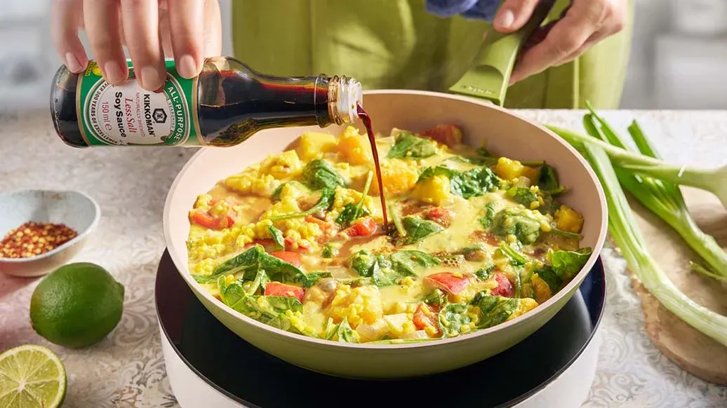 Skrell gresskaret og skjær det i store terninger. Kok linsene i vannet sammen med gresskar og gurkemeie i 20 minutter. Bruk en stekepanne til å sautere sjalottløken og paprikaen i kokosolje i 2–3 minutter, tilsett deretter hvitløk og ingefær og stek i 30 minutter. Rør inn kokte linser og gresskar, hell i kokosmelken og la det småkoke i 5 minutter. Tilsett mango og spinat og kok i 1–2 minutter. Krydre med limesaft og Kikkoman Soyasaus – Mindre Salt.