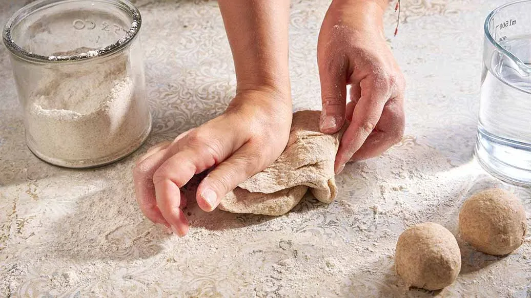 1 ½ dl sammalt mel – 20 g ekstra mel til utbaking – 100 dl varmt vann – 20 g klaret smør (ghee), smeltet