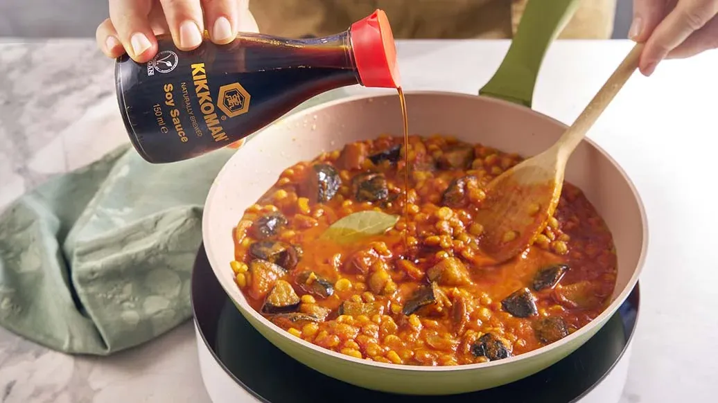 Ha tomatpassata oppi grønnsakene fra steg 1, krydre med Kikkoman Soyasaus og kok i 5 minutter.