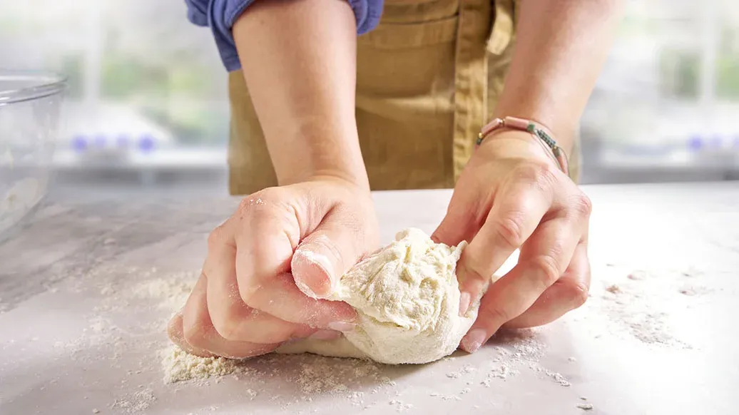 200 g hvetemel – 20 g ekstra mel til utbaking – ½ ts bakepulver – ½ ts natron – 0,4 dl melk, lunken – 75 g yoghurt naturell