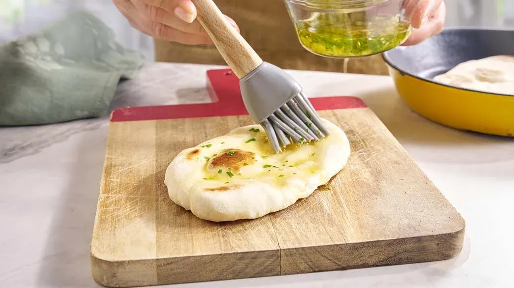 Bland 200 g mel med bakepulver og natron i en stor bolle. Hell den lunkne melken gradvis oppi bollen under omrøring for å lage deigen. Tilsett deretter yoghurten. Kna deigen i 5 minutter til den blir glatt og spenstig. Dekk den med et fuktig håndkle eller plastfolie og la stå på et lunt sted i ca. 20 minutter. Del deigen i fire porsjoner og kjevle hver av dem ut til et ca. 3–4 mm tykt, ovalt flatbrød. Dryss over 20 g av det ekstra melet.