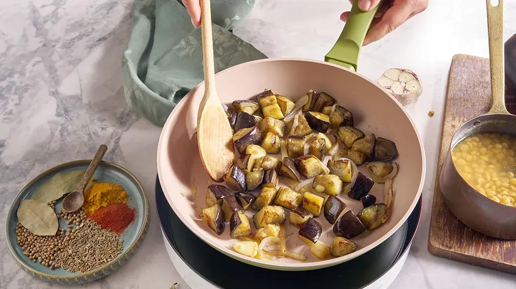 Skjær toppen av hvitløkshodet så feddene kommer til syne. Pensle med olje og stek i ovnen ved 180 °C i ca. 30 minutter. Kok chana dhal i grønnsakskraften i 40 minutter. Bruk en panne til å sautere rødløken og auberginen i klaret smør i 5 minutter til de er gylne, og press deretter inn den ovnsstekte hvitløken. Tilsett spisskummenfrø, gurkemeie, korianderfrø, paprikapulver og laurbærblader, og stek i 10–15 minutter så aromaen slippes.