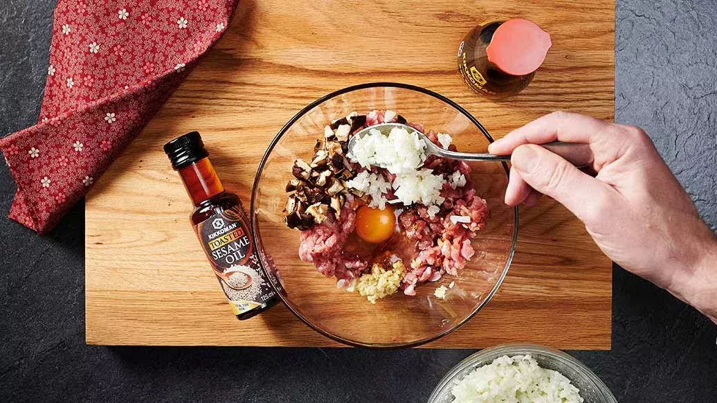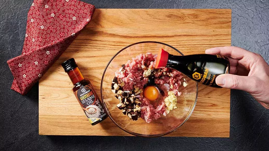 Ha det finhakkede kjøttet i en stor bolle. Tilsett shiitakesopp, ingefær, sukker, kjøttkraft, soyasaus, egg, sesamolje og sake og kna alt godt for hånd.