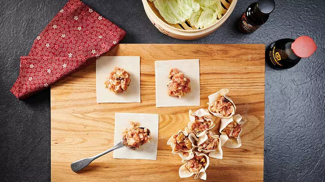 Spre ut deigene på en arbeidsflate og legg ca 30 g kjøttfylling på hver deig. Form deigen med fyllet til en blomst. Trykk bunnen litt flatt slik at shumaiene kan stå oppreist.