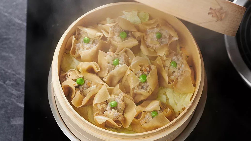 Dryss over de frosne ertene med potetmelet du la til side, og legg 1 ert på hver shumai. Plasser shumaiene i en dampekurv med tilstrekkelig avstand og damp over høy varme i omtrent 8 minutter. Server shumaiene med soyasaus og sennep.
