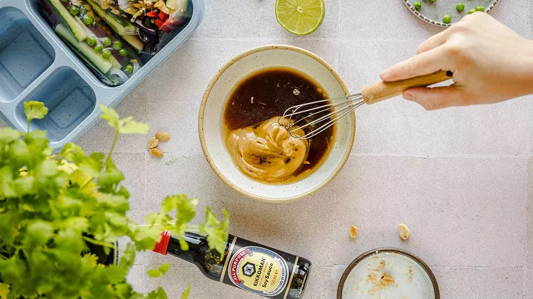 2 ss Kikkoman Naturlig Brygget Soyasaus – 1 ss Kikkoman ristet Sesamolje – 1 ss lønnesirup – 1 ss limesaft – 1 ss peanøttsmør – 2 ss fersk koriander