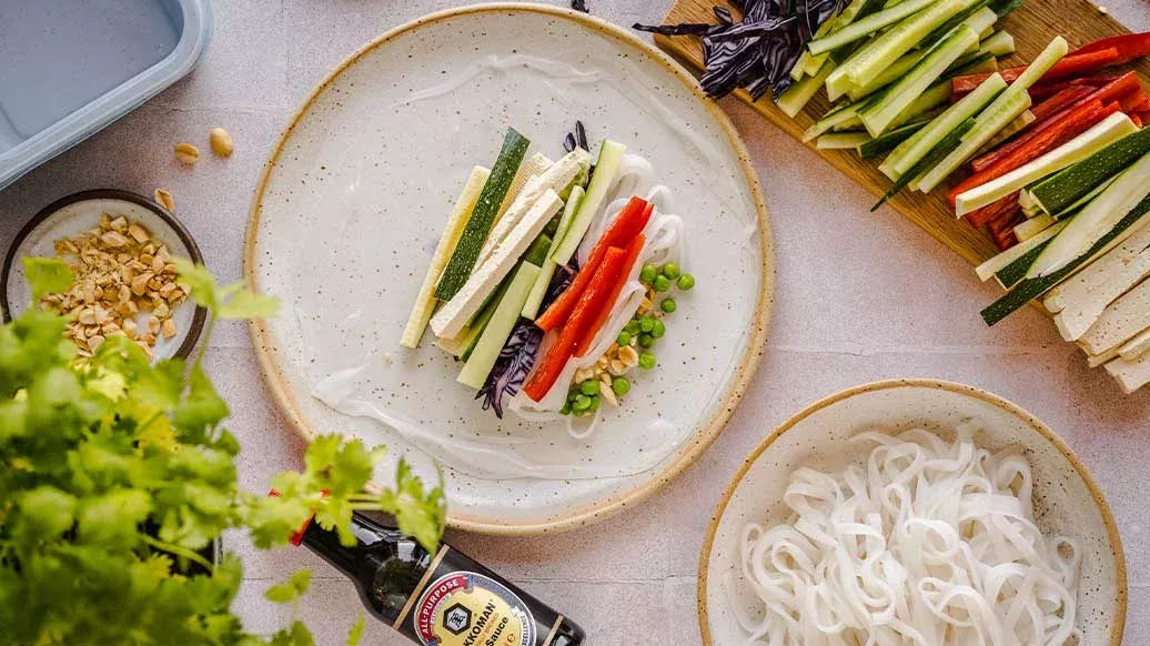 Legg en porsjon nudler, tofu, hakkede grønnsaker, kokte erter og peanøtter på et ark rispapir. Rull det forsiktig sammen.