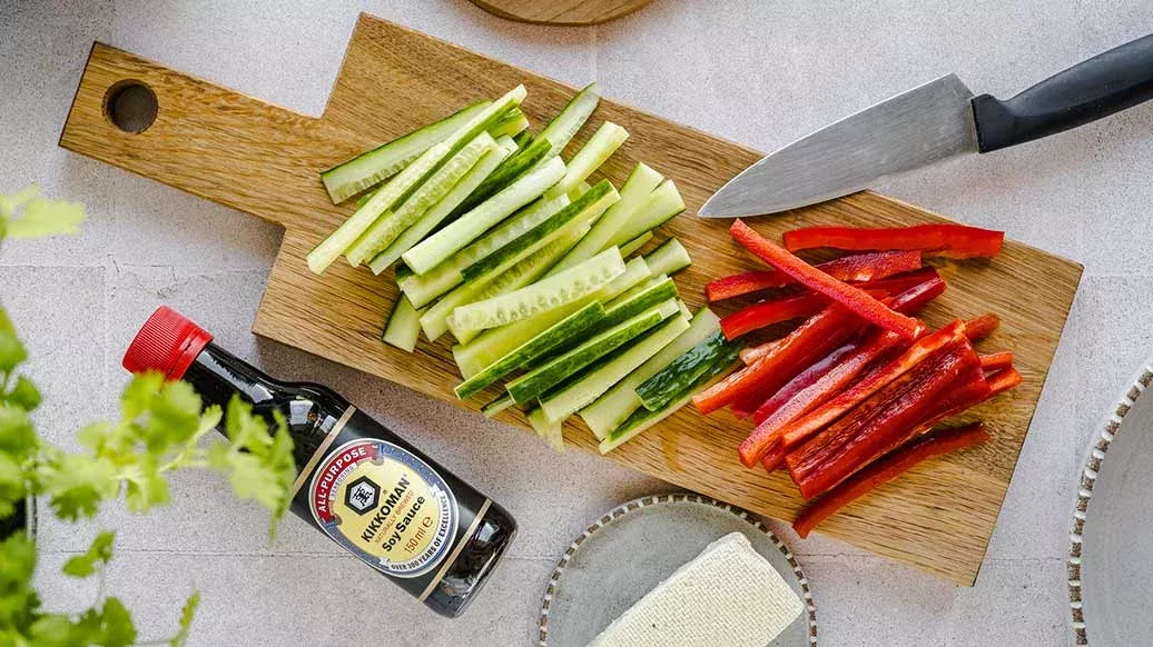 Skjær grønnsakene og tofuen i staver. Legg rispapiret i vann til det mykner.