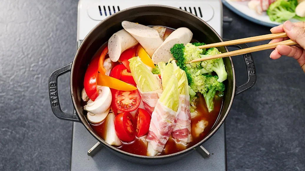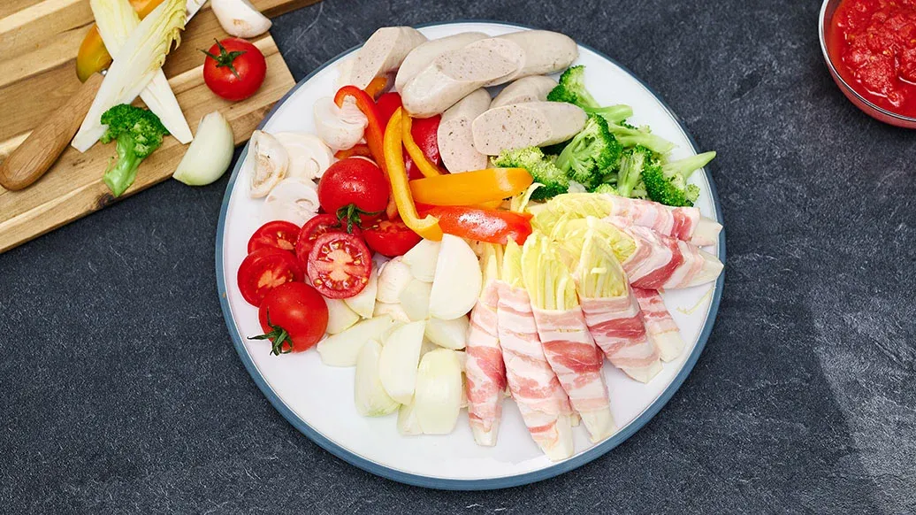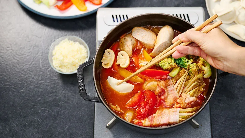 En enkel hot pot med velkjente europeiske ingredienser, med syrlighet fra tomater og krydder fra Kikkoman Kimchi Chilisaus. Røykfylt bacon, pølser og smeltet ost sørger for fyldig umamismak. Rask å lage ved bordet og perfekt til å dele.