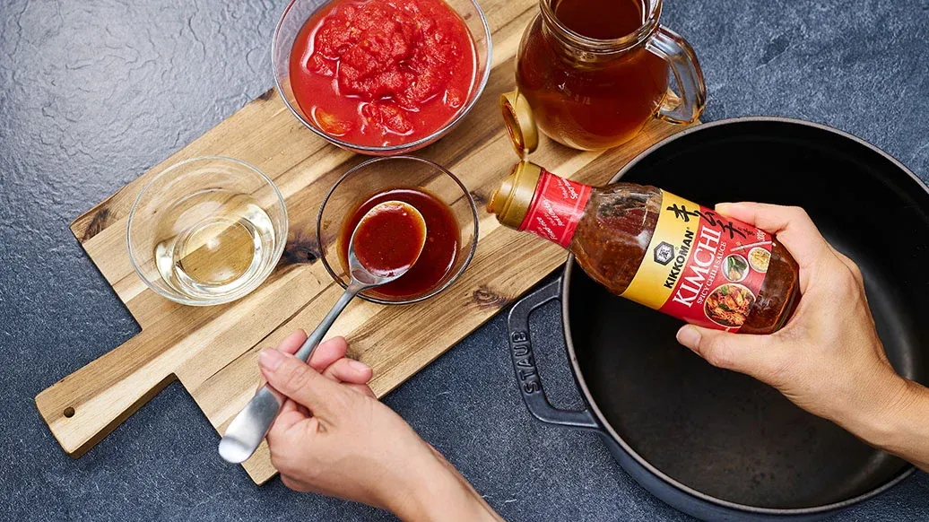 500 dl kyllingkraft – 400 g hakkede tomater på boks – 50 dl hvitvin – 4 ss Kikkoman Krydret Chilisaus til Kimchi