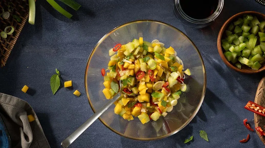150 g mango, skåret i små terninger – 200 g agurk, skrelt og skåret i små terninger – 20 g ingefær eller galangal, skrelt og hakket – 1 rød chili, hakket – 3 vårløk, skåret i skiver – ½ bunt thaibasilikum, bladene plukket – 3 ss Kikkoman en Blanding av Soyasaus, eddik og Sitronaromaer