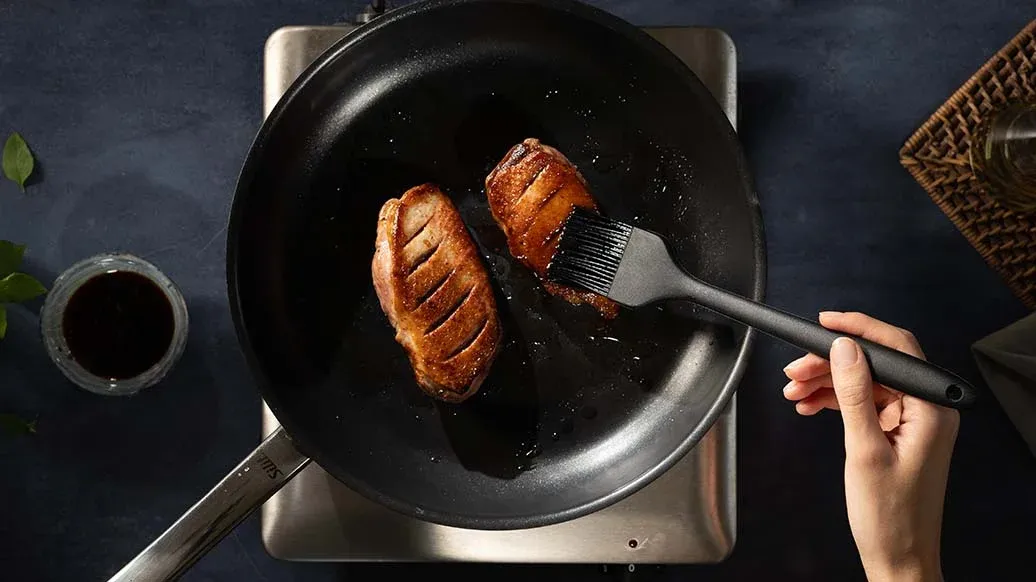 Snitt skinnet på andebrystet på langs og på tvers med ca. 5 mm mellomrom. Stek med skinnsiden ned i en panne eller på grillen på middels varme i 12 minutter til skinnet er gyllenbrunt og sprøtt. Pensle med Kikkoman Teriyaki BBQ-Saus i koreansk stil, snu brystet, pensle igjen og stek i ytterligere 4 minutter. Snu to ganger til, og pensle med saus hver gang. La det deretter hvile i en bolle.