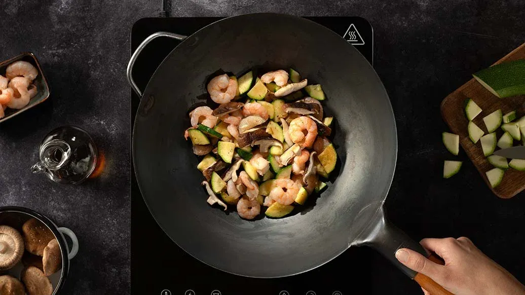 Varm opp den vegetabilske oljen i en stor wokpanne, og stek squashen og soppen på sterk varme i 2 minutter. Tilsett kongerekene og wokk i ytterligere 3 minutter. Deglaser med Kikkoman Teriyaki Woksaus med Hvitløk og rør kort om mens innholdet glaseres.