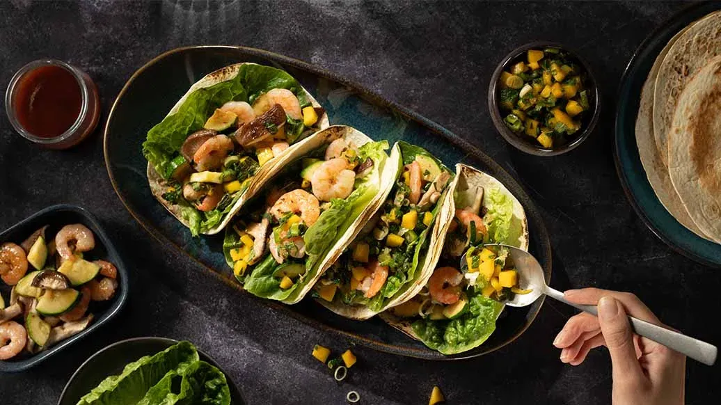 Legg salatbladene i tacoskjellene og fyll med Kikkoman Kimchi Chilisaus, mangosalsa, reker og grønnsaker.
