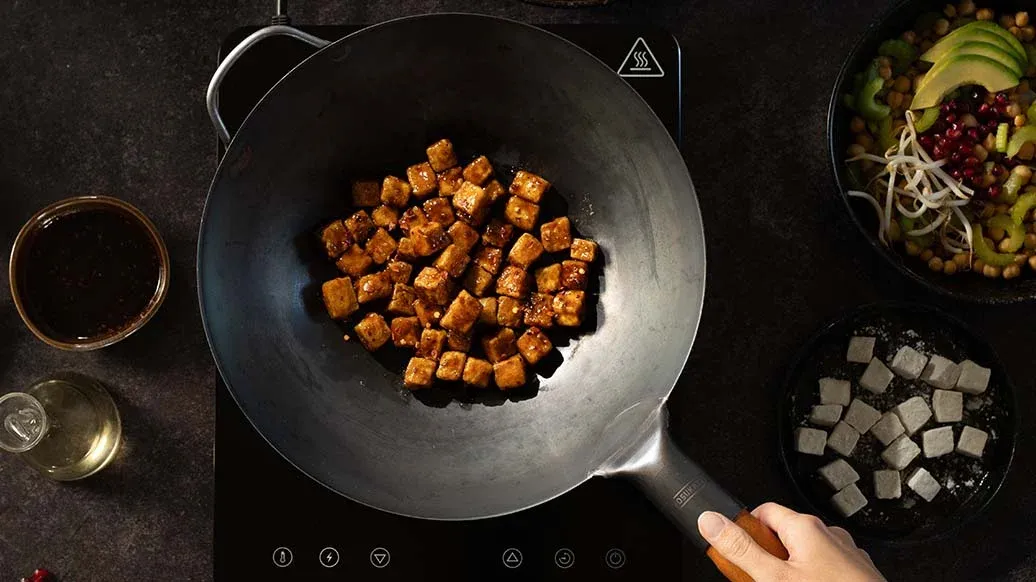 Stekt tofu blir ekstra sprø og smakfull hvis du presser den i rundt 2 timer først. Da slipper den mindre fuktighet under steking og absorberer mer marinade. Det finnes egne tofupresser der du kan legge i hele blokken, men du kan også skjære tofuen i store terninger, pakke dem inn i kjøkkenpapir og legge noe tungt oppå, for eksempel en full melkekartong.