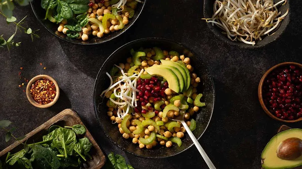 En ekte proteinskål med belgfrukter – kikerter, tofu og spirer – pluss antioksidanter, sunne fettsyrer og en god dose klorofyll fra granateplekjerner, avokado og spinat.