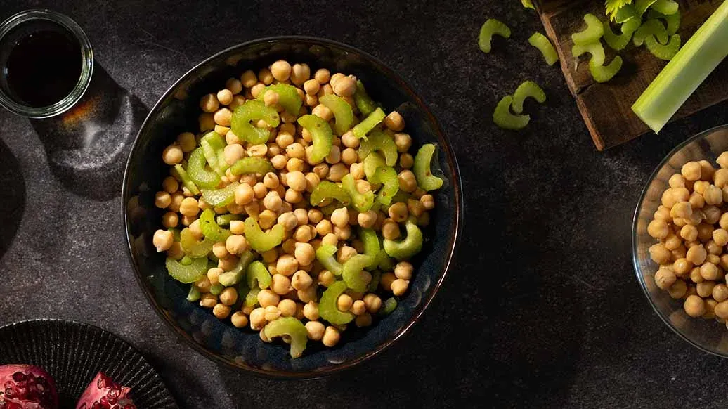 Sil av kikertene (ta vare på kokevæsken – kjent som aquafaba – til supper eller andre formål). Bland kikertene og sellerien i en bolle sammen med Kikkoman Teriyakisaus med Sesam og Kikkoman Ponzu Sitron.