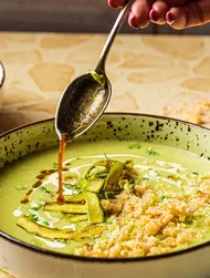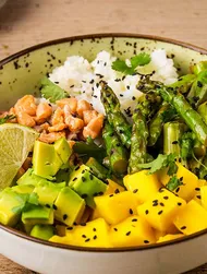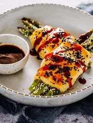 Skrell løk og skjær i sigdformede stykker, vask, rens og skjær paprika i grove terninger, skjær bambusskudd og shiitakesopp i skiver. Stek løk og paprika i 2 spiseskjeer olje, småsurr det deretter sammen med bambusskudd og sopp. Ha i noen stykker sitronskall og rør ut med sitronsaft og litt av vannet fra bløtleggingen av shiitakesoppen. Smak til med soyasaus. Jevne eventuelt med litt maizena.