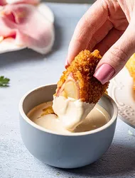 Dekk shiitakesopp til med vann og bløtlegg i minst ½ time. Salt og pepre fisken og snu i maizena. Bland strøkavring og sesamfrø. Rør egg sammen og snu fisken først i egg, så i strøkavring. Trykk paneringen litt fast.