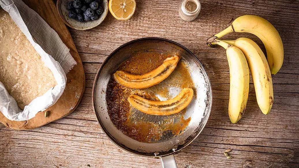 Varm opp kokosoljen i en stekepanne, tilsett lønnesirup og Kikkoman Soyasaus – Mindre Salt. Legg bananhalvdelene i pannen og karamelliser i 1 minutt på hver side.