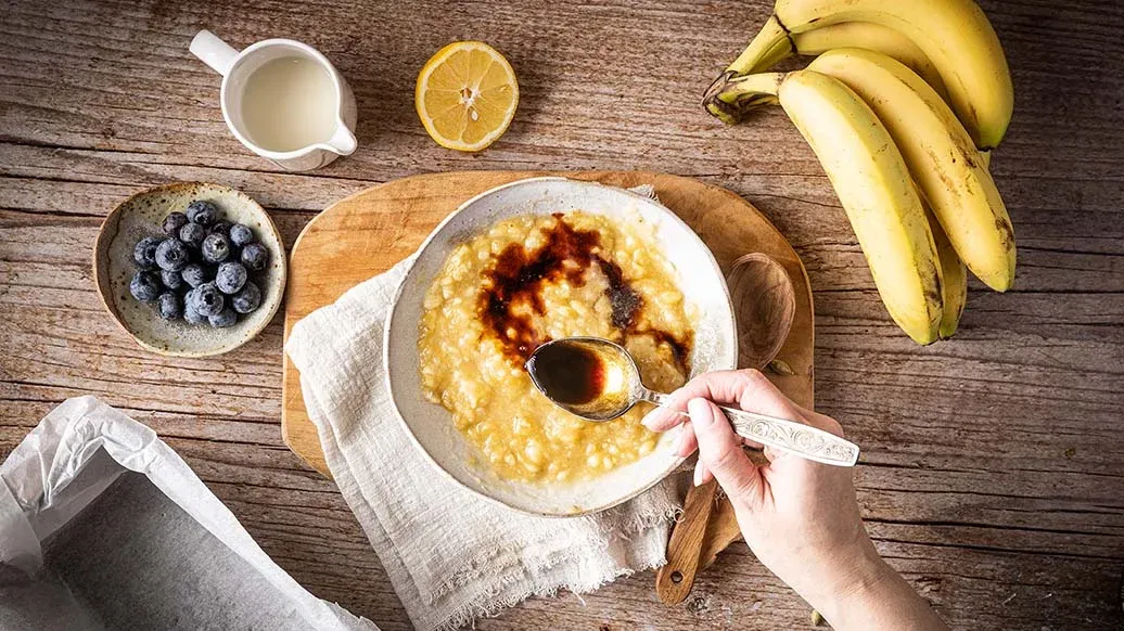 2 modne bananer (ca. 200 g) – 1 ss sitronsaft – 1 ss Kikkoman Naturlig Brygget Soyasaus Med Mindre Salt – 0,8 dl vegetabilsk olje – 1 dl plantebasert melk (f.eks. havremelk)