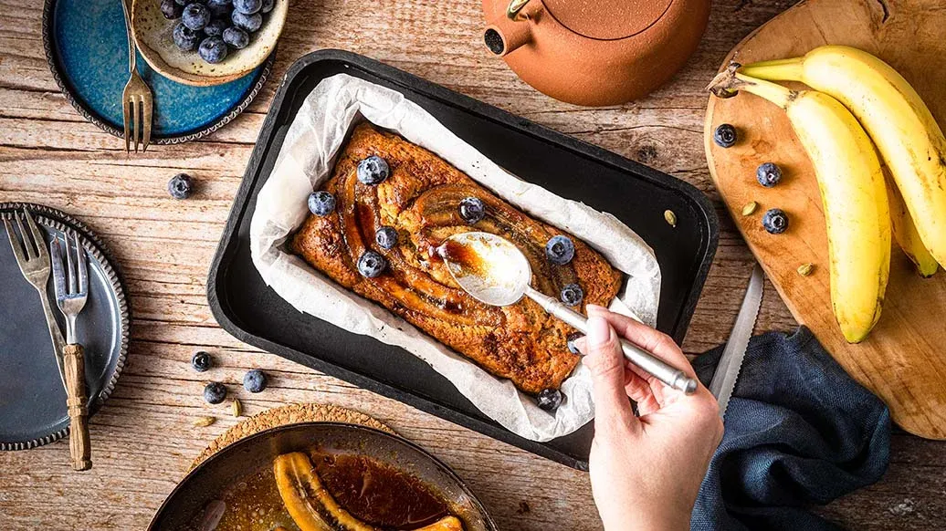 Bananbrød med kardemomme som får en rik og balansert smak ved at Kikkoman Soyasaus – Mindre Salt fremhever sødmen i bananene og lønnesirupglasuren samt gir det aromatiske og fuktige brødet dybde og en diskré umamivri.