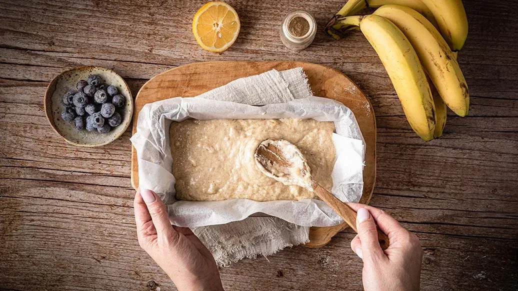 Legg de karamelliserte bananhalvdelene oppå røren og ringle over resten av glasuren fra pannen. Garner med blåbær. Stek i ovnen ved 180 °C i ca. 45 minutter. La bananbrødet avkjøles før det skjæres opp og serveres.