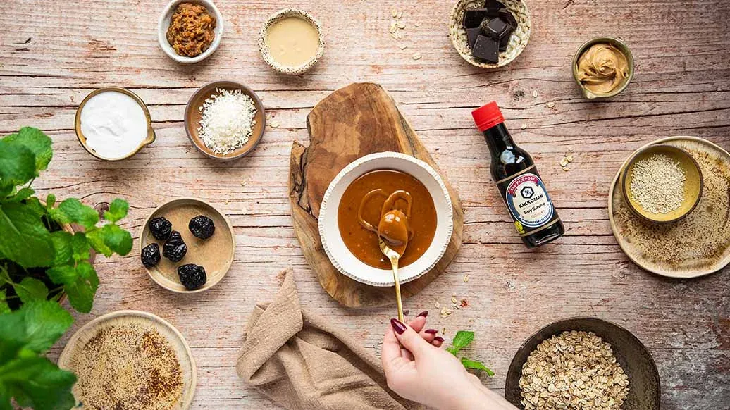 30 g havregryn – 80 g svisker – 10 g kokosmasse – 1 ss peanøttsmør – 1 ts tahini – 1 ss lønnesirup – ½ ss Kikkoman Naturlig Brygget Soyasaus