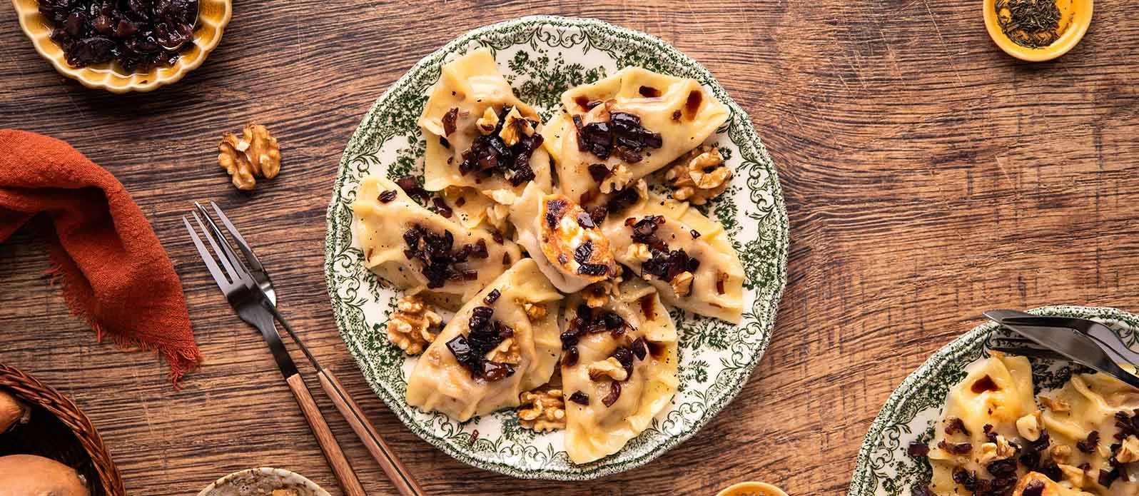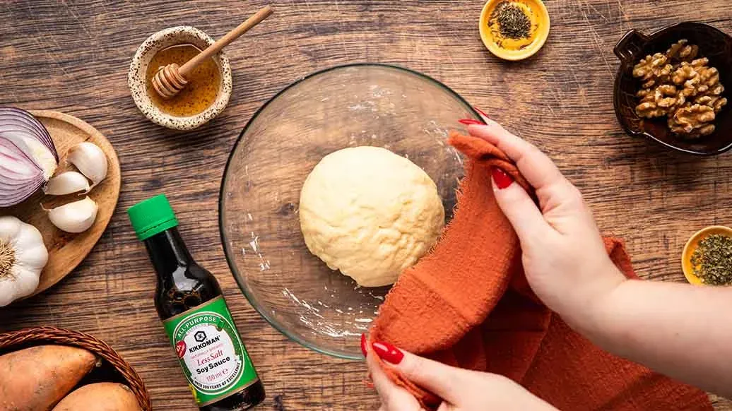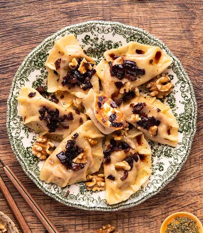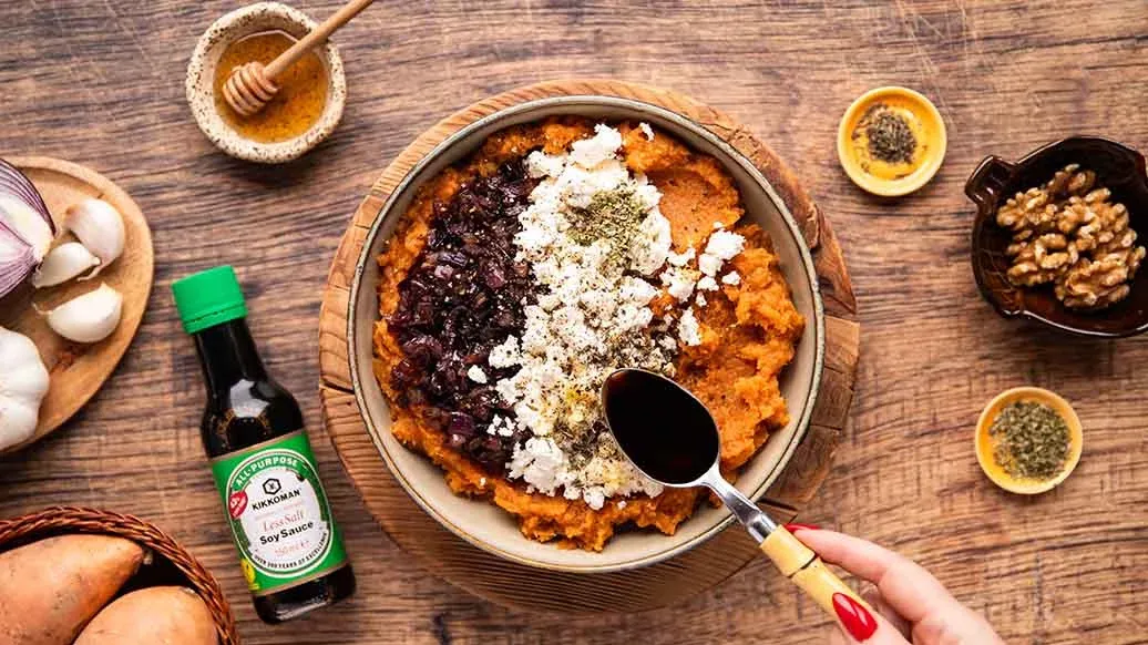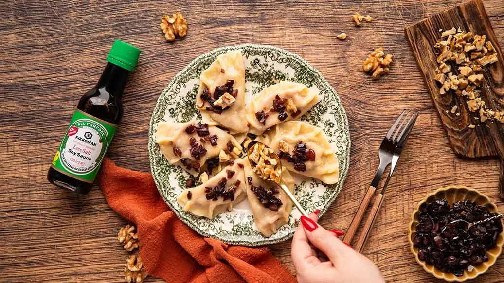 Pierogi med en vri: polske dumplings fylt med søtpotet, fetaost og karamellisert rødløk. En skvett Kikkoman Soyasaus – Mindre Salt tilfører umamidybde, mens hakkede valnøtter gir en behagelig krønsj i denne søtsalte godbiten.
