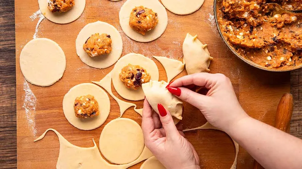 Kjevl ut deigen og stikk ut sirkler ved hjelp av et glass. Legg en skje fyll i midten, brett deigen i halvmåneform og klem sammen kantene for å lukke dem. Kok dumplingsene i saltet vann i 4 minutter etter at de har flytt opp til overflaten.