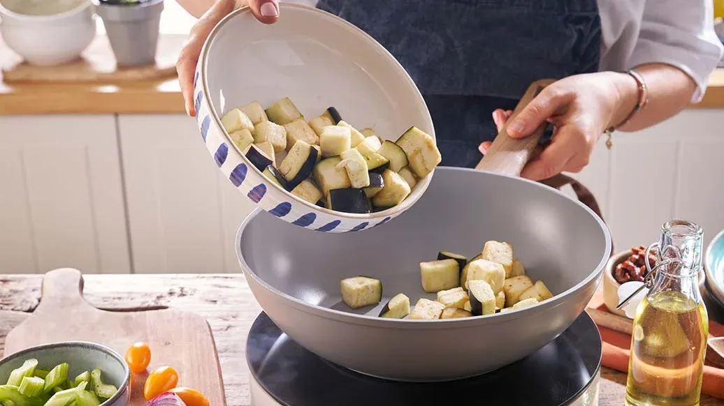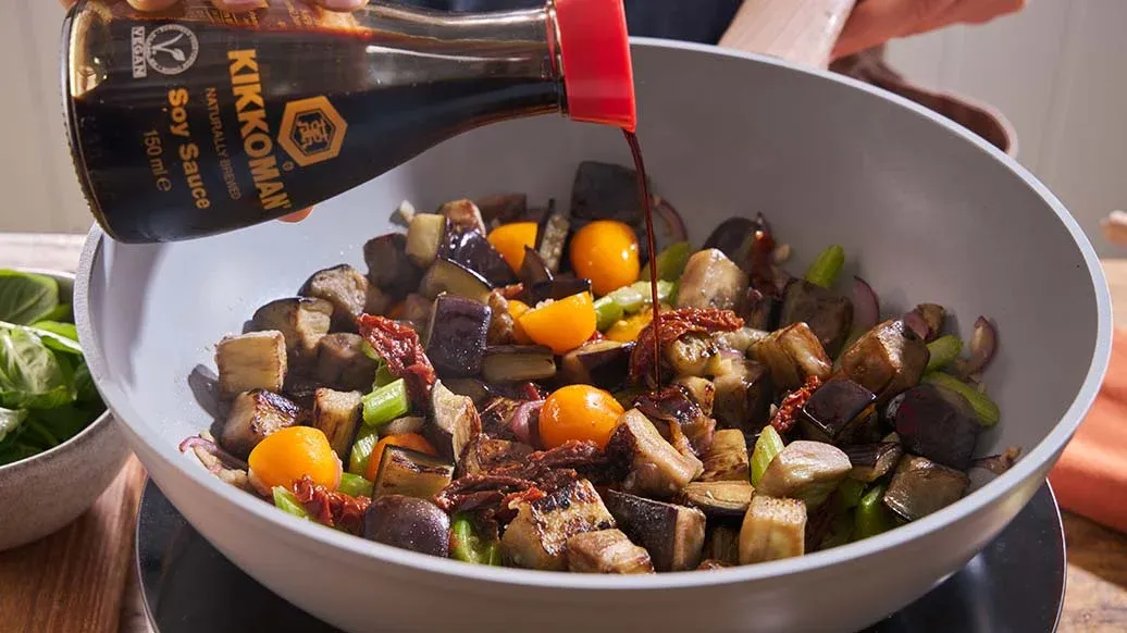 En fargerik wokrett som bugner av middelshavssmaker – røykfylt aubergine, søte tomater og aromatisk basilikum raffinert av den dype smaken av umami fra Kikkoman Soyasaus.