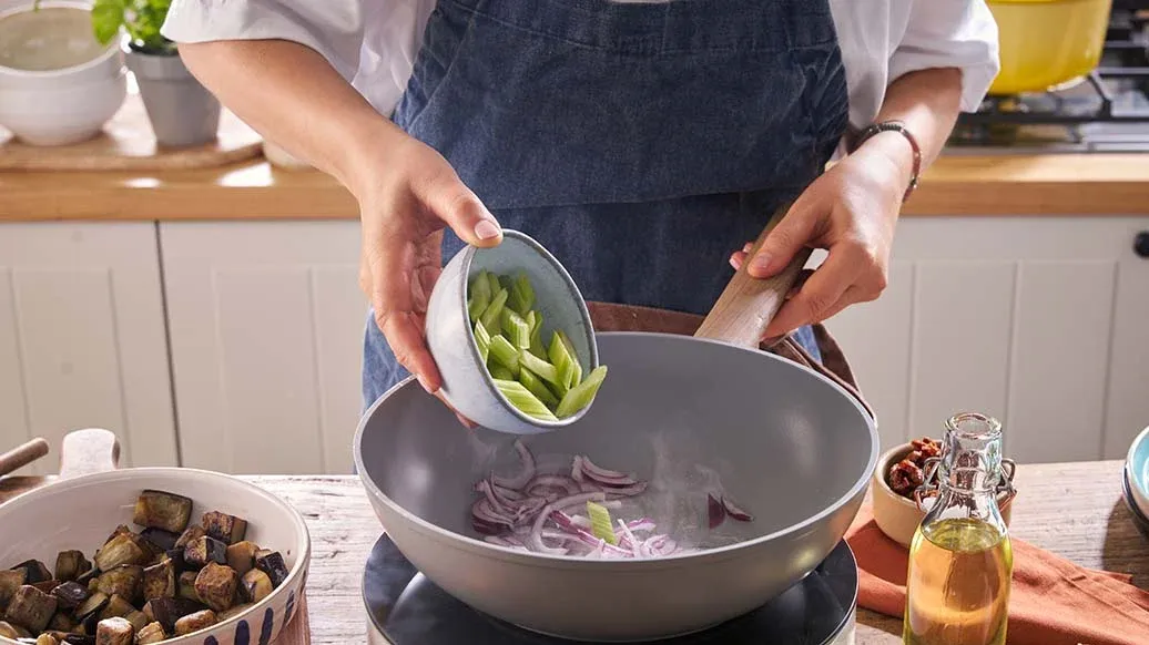 Varm opp oljen i den samme wokpannen, tilsett rødløk, hvitløk og selleri og wokk i 1–2 minutter.