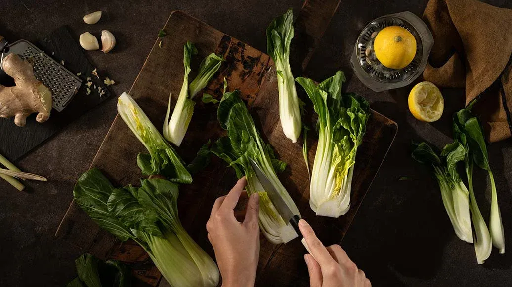 300 g mini-pak choy – 1 stilk sitrongress – 30 g ingefær, skrelt og hakket – 2 fedd hvitløk, skrelt og tynt oppskåret – 3 ss sitronsaft