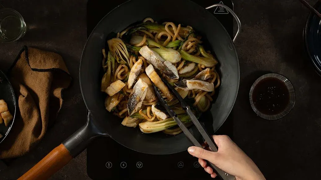 Raskt, elegant og sunt: mør havabborfilet, sprø pak choy og myke udon-nudler stekes i wok og vendes i en sitrusfrisk teriyakimarinade. Skikkelig god trøstemat – uansett ukedag.
